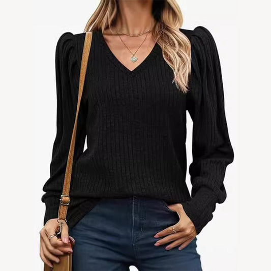 Women's V-Neck Pleated Sleeve Casual Top
