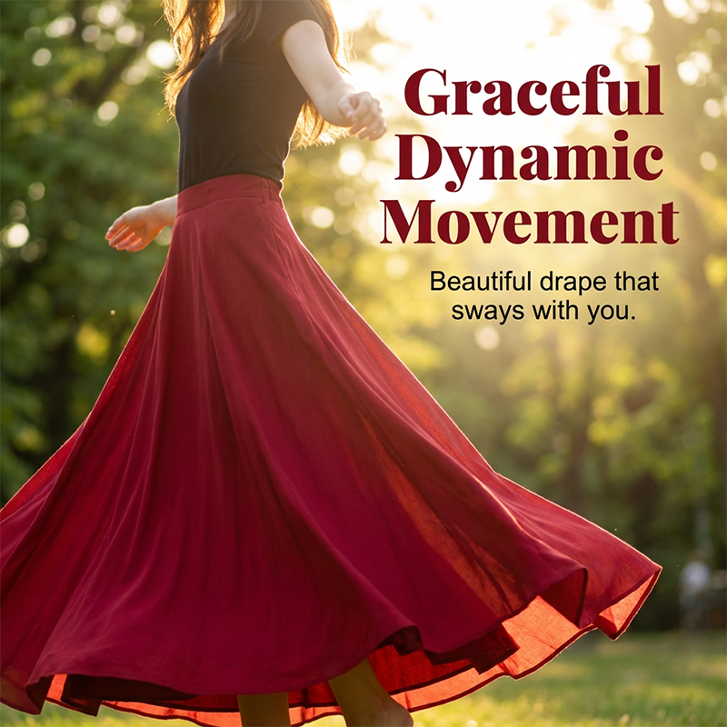 GRACEFUL DYNAMIC MOVEMENT - Experience the freedom of movement with a generously pleated hemline. The fabric catches the breeze beautifully, creating a graceful, dynamic flow with every step you take.