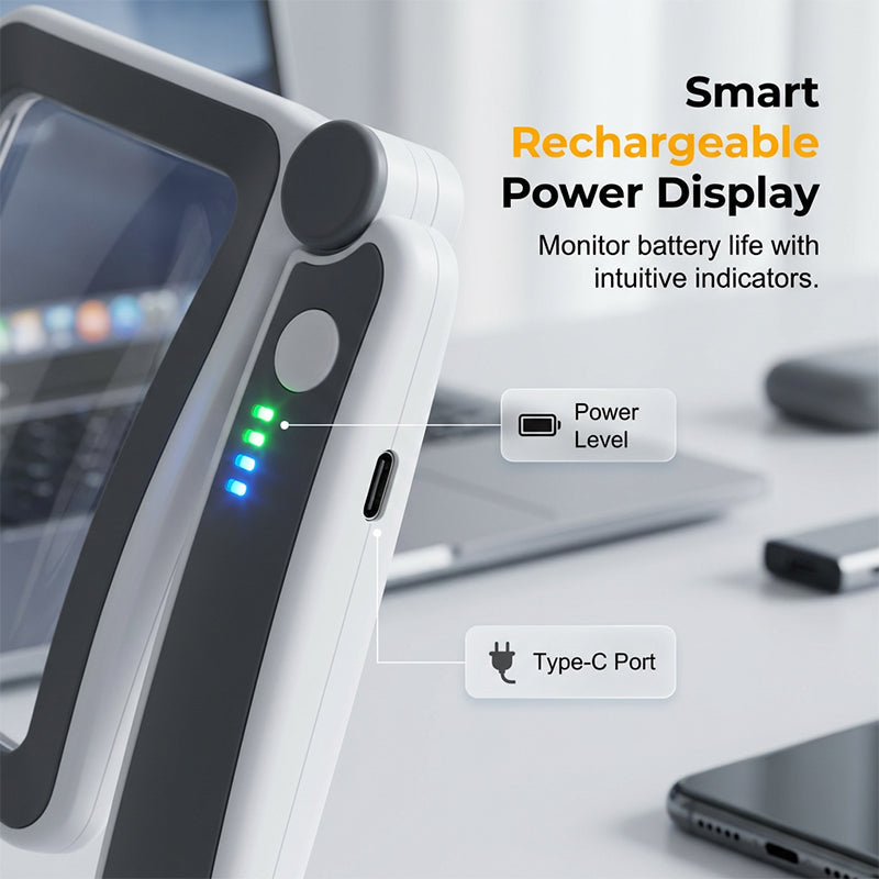 SMART RECHARGEABLE POWER DISPLAYĀ - Say goodbye to constant battery replacements. The built-in rechargeable battery features a convenient 4-stage LED power display, ensuring you always know exactly how much charge remains for uninterrupted reading.