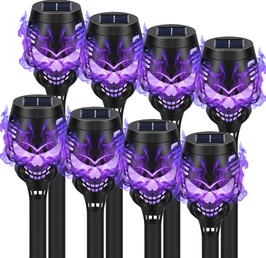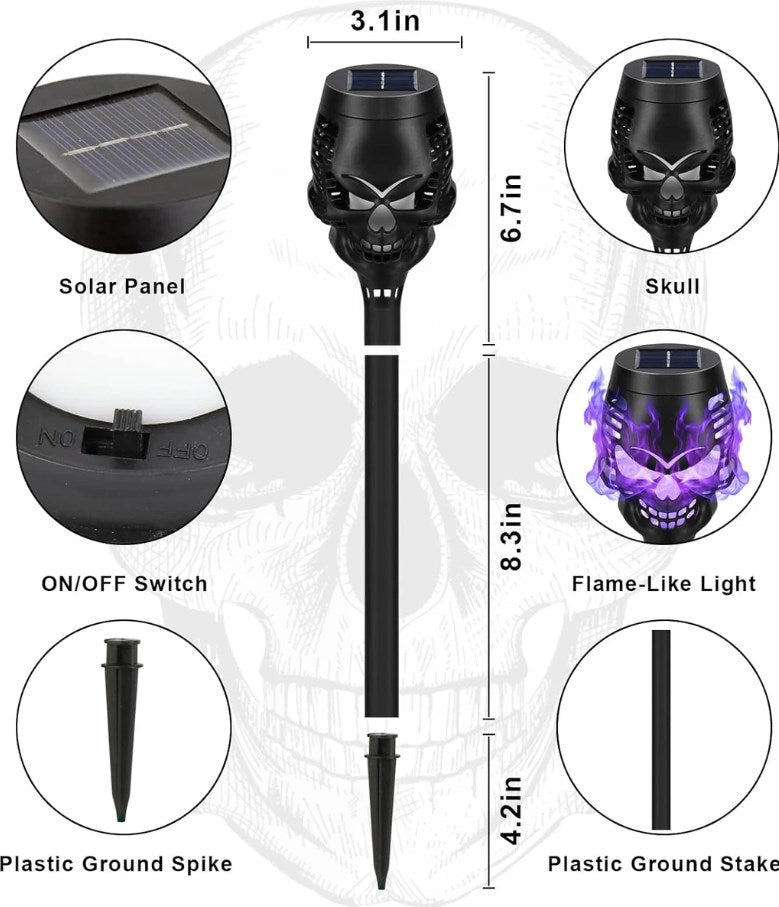 Unique Skul Flickering Flames Torch Lights: Our solar powered garden stake lights are shaped in spooky skull. The flickering flame effect, combined with the design of the skull, perfect for Halloween outdoor parties and events