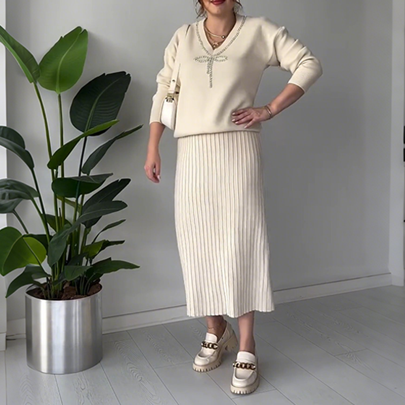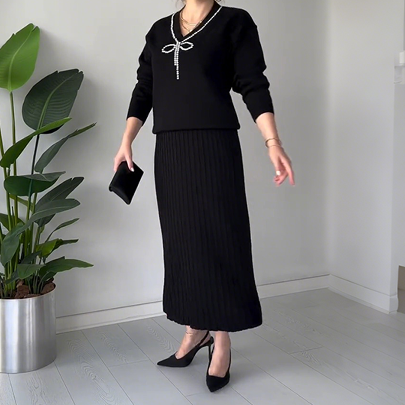 Women's Elegant Rhinestone Bow Two-Piece Sweater & Skirt Set