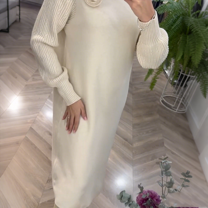 CHIC RIBBED SLEEVES: The contrasting ribbed texture on the sleeves adds a subtle yet stylish element to the overall design, enhancing the aesthetic and giving the dress a more modern and structured appearance.