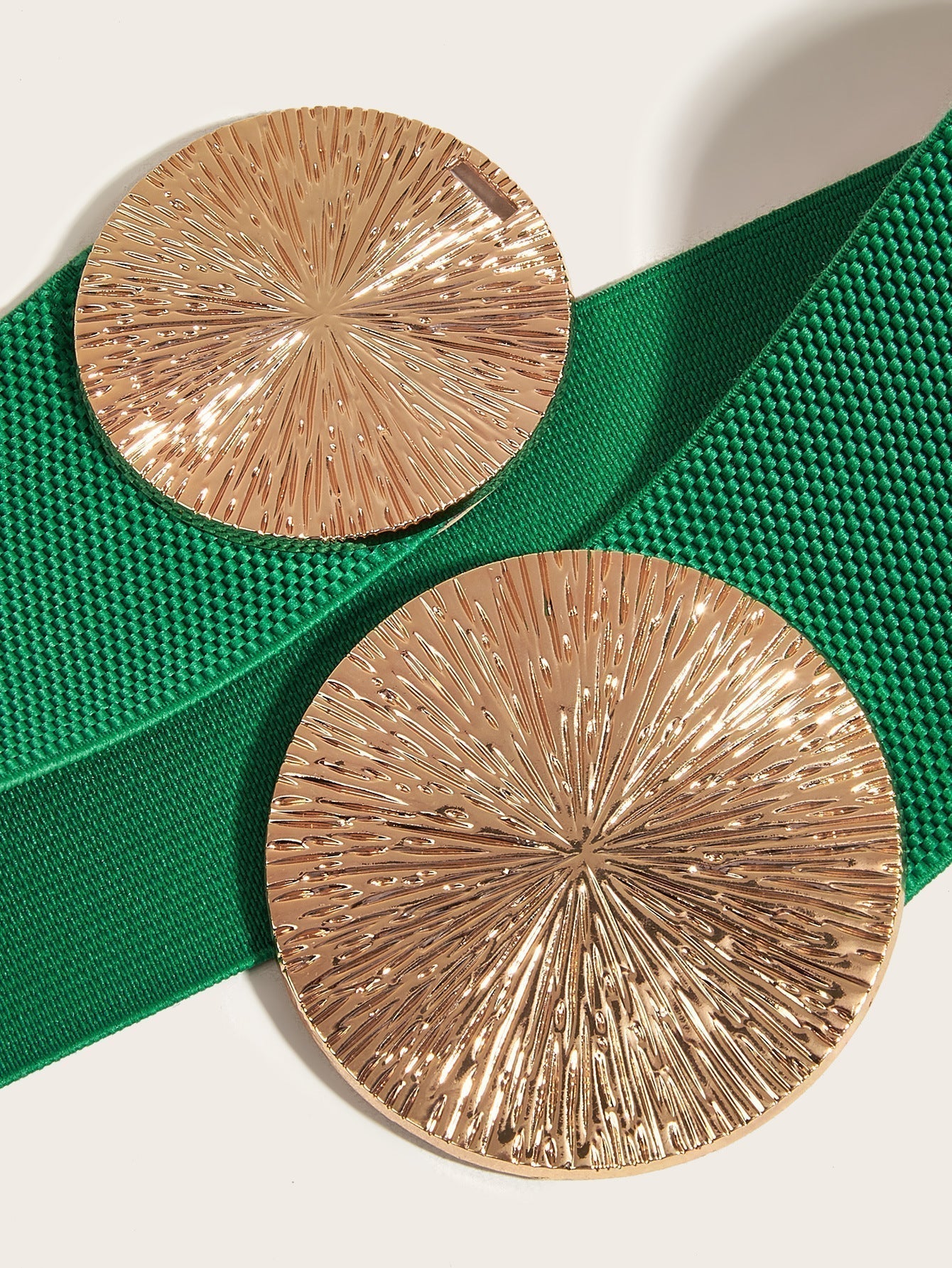 Belt length: 70 cm Belt buckle material: Alloy Closure type: Hook Width: Wide style (>4cm) Design details: Double round buckle with elastic adjustment